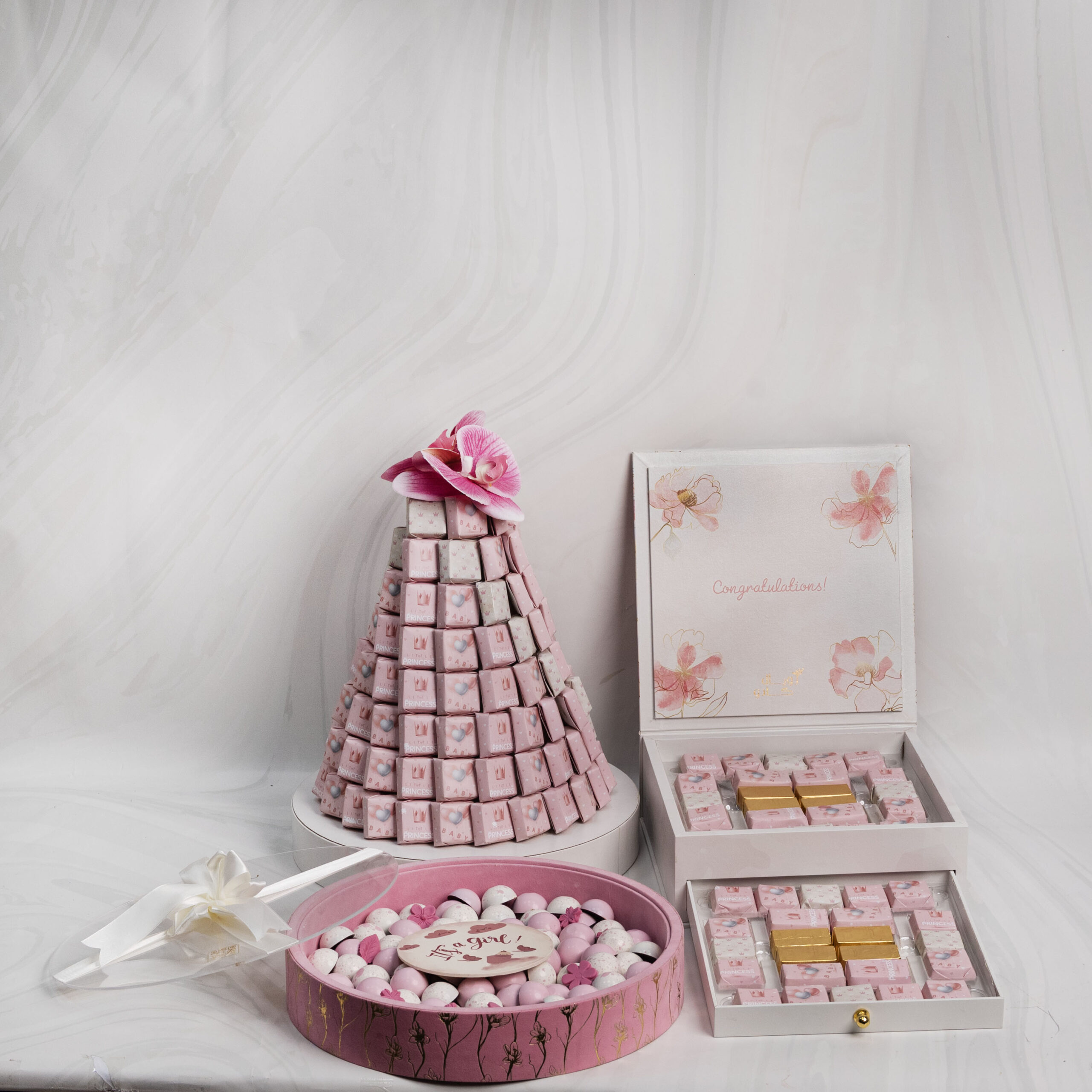 Celebrate the arrival of a beautiful baby girl with this complete chocolate gift set, featuring an elegant chocolate cone, a premium chocolate box, and a beautifully arranged chocolate tray.