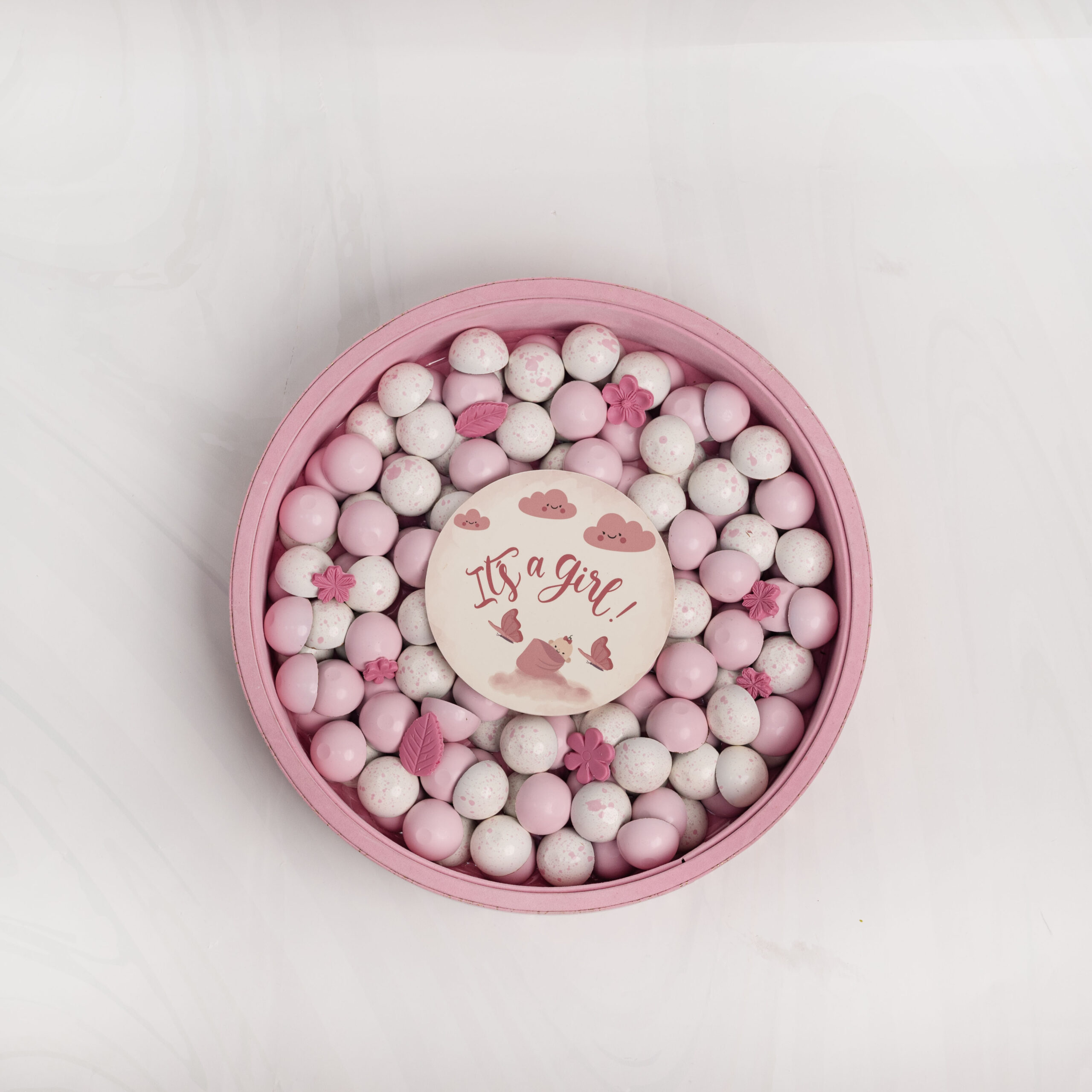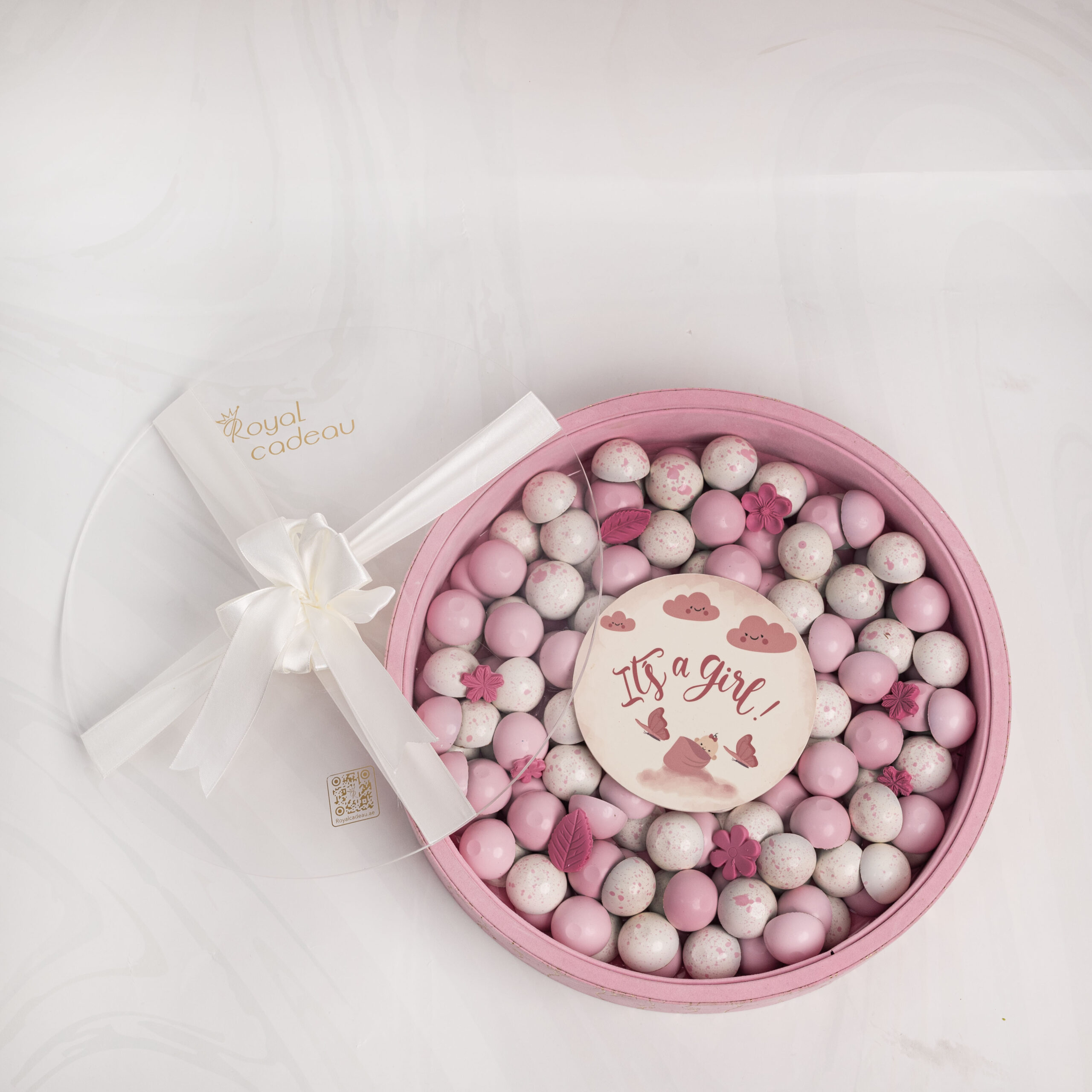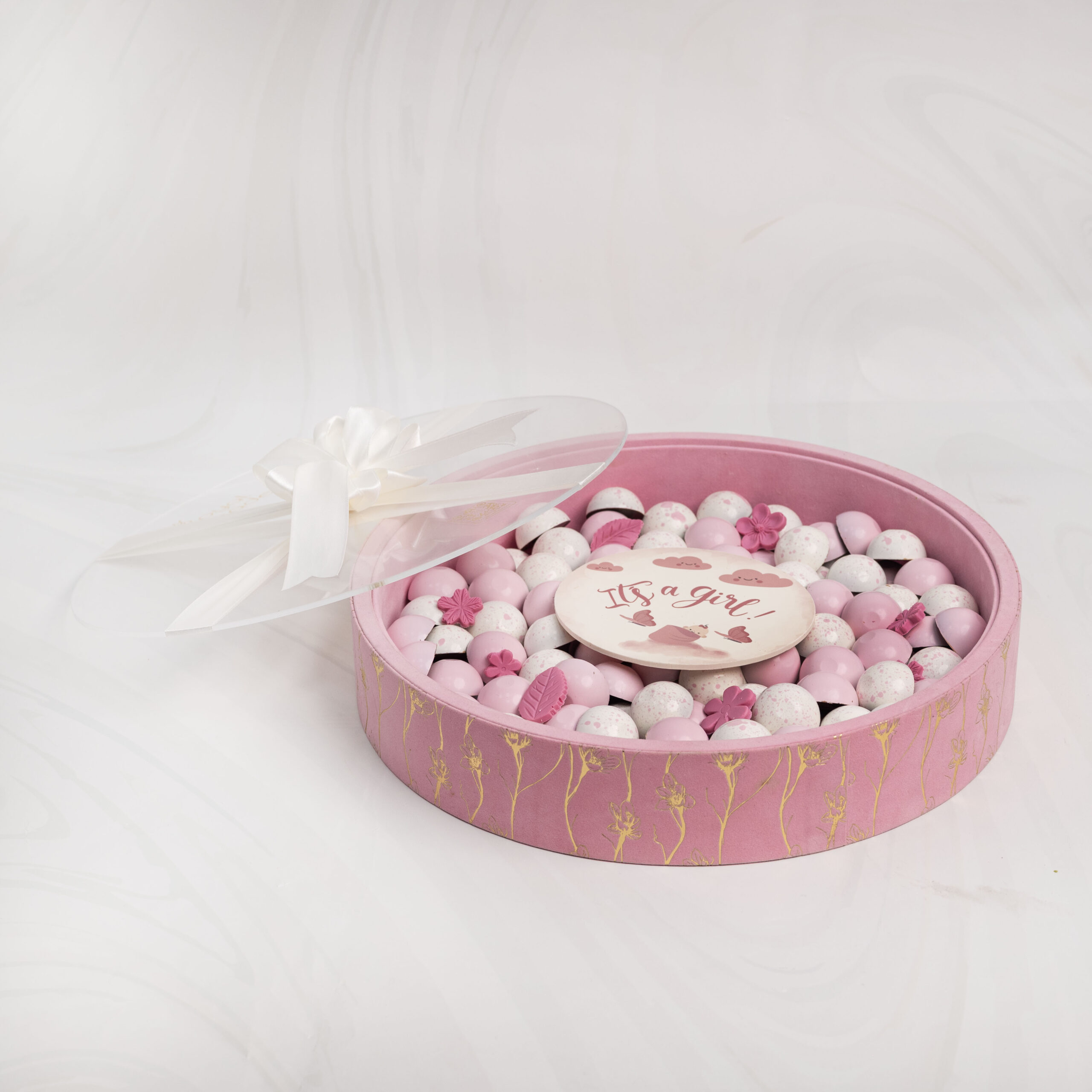 Celebrate the arrival of a precious baby girl with this elegant chocolate tray, designed in soft pink tones and filled with premium assorted chocolates.