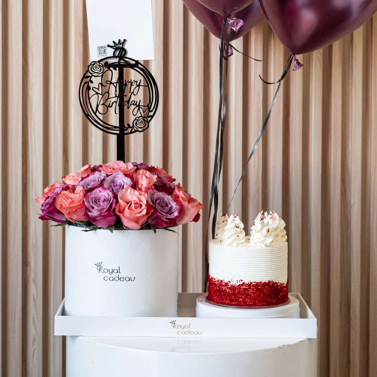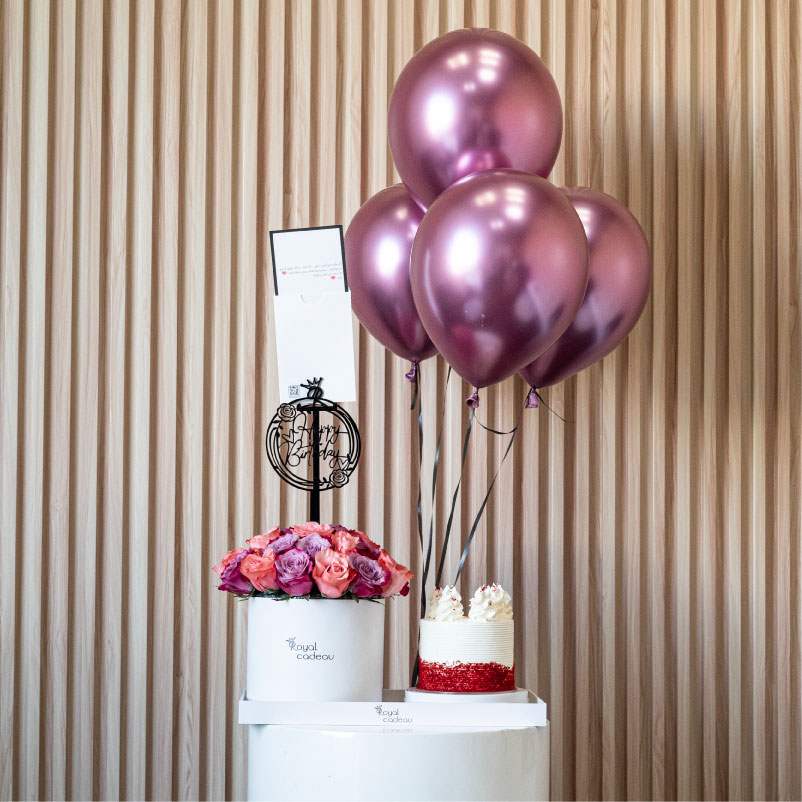 The vase showcases a stunning mix of red, purple, and light pink roses, perfectly complemented by the luscious cake, cheerful balloons, and birthday details—making it the ultimate birthday celebration in style.